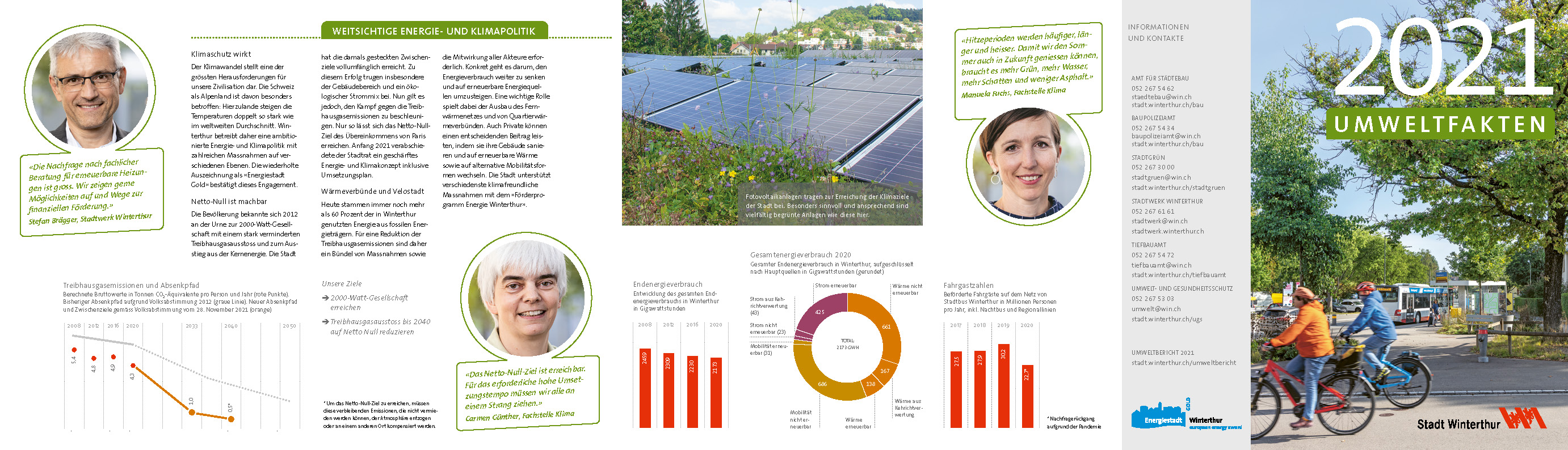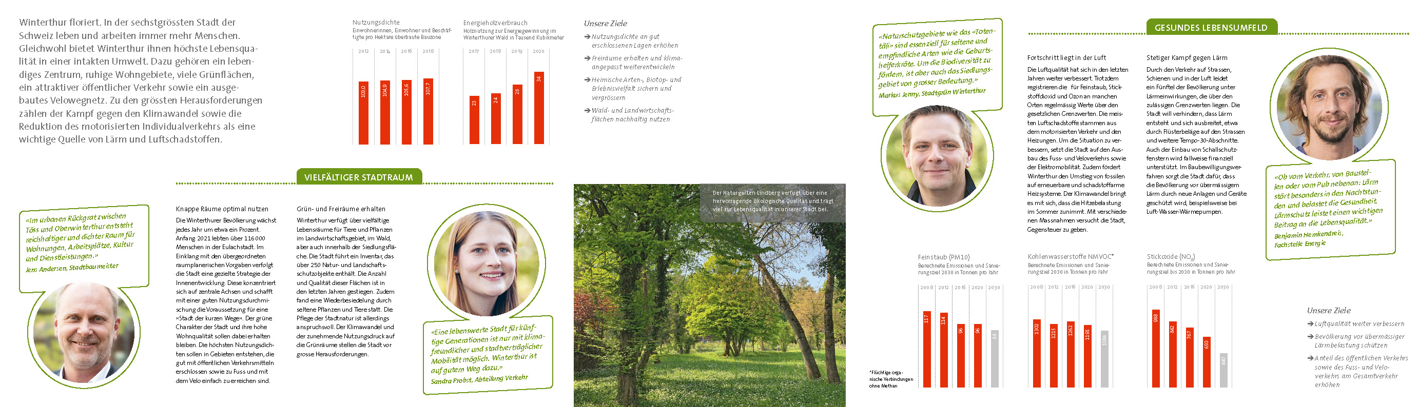 Die Fachstelle Umwelt- und Gesundheitsschutz der Stadt Winterthur berichtet alle vier Jahre über den Umweltzustand der Stadt. Eine rund 70 Seiten starke PDF-Publikation informiert Fachleute und Politiker/innen detailliert über Fortschritte und Erfolge, welche die Stadtverwaltung bereits erzielt hat – aber auch, wo es noch Handlungsbedarf gibt. Mit einem attraktiven Faltblatt spricht die Stadt zudem weitere Kreise an und vermittelt ihnen die wichtigsten Fakten.