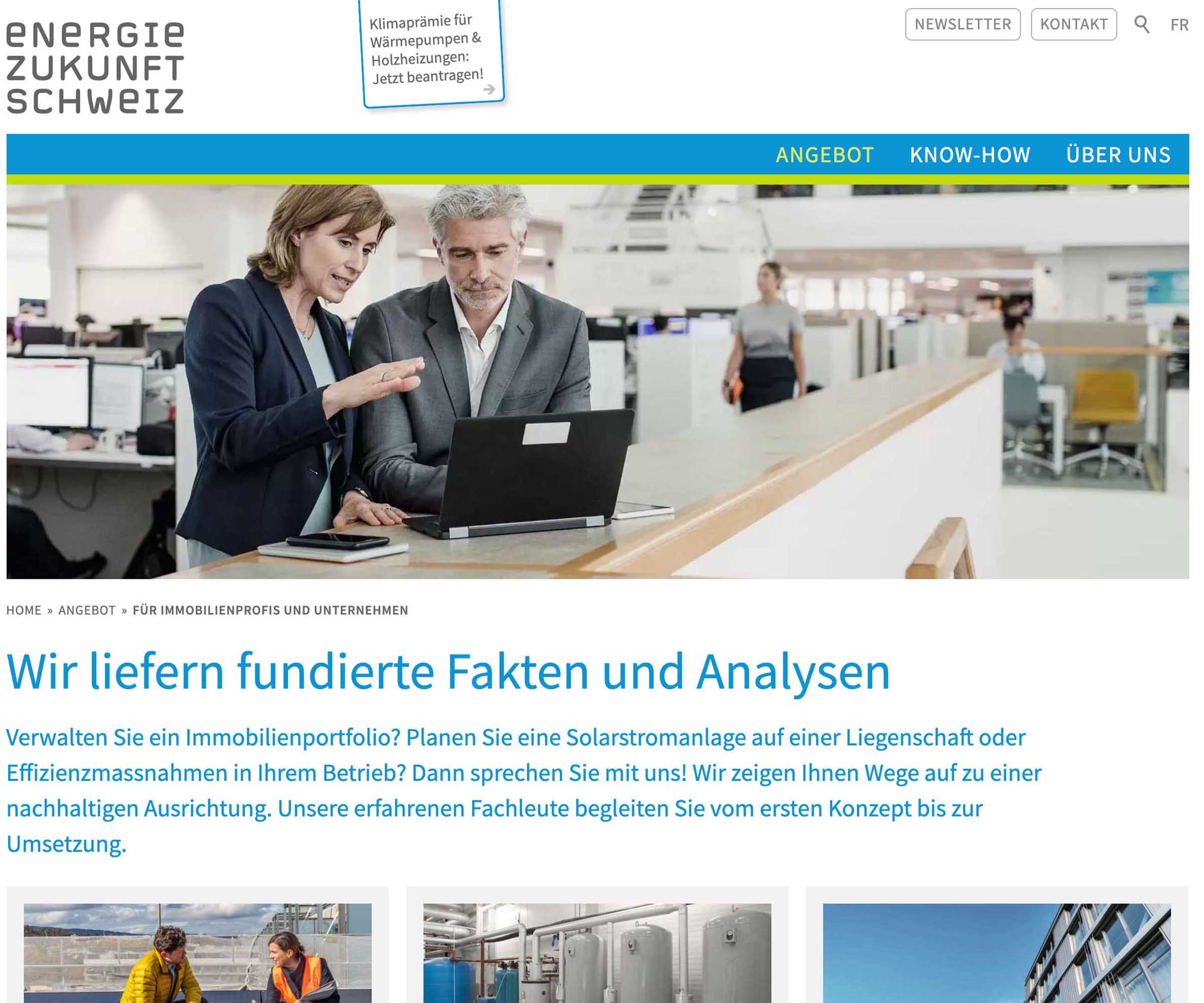 Mit Energie Zukunft Schweiz verbindet unsere Agentur eine langjährige Zusammenarbeitauf verschiedener Ebene. So setzte unsere Agentur einen Relaunch des umfangreichen Webauftritts um, der sowohl die Konzeption als auch die Inhalte und Gestaltung betraf. Ziel war es, mit überschaubarem Aufwand deutliche Verbesserung der Usability und eine Auffrischung in der Gestaltung zu erreichen. Dies gelang innerhalb einer Umsetzungszeit von nur zwei Monaten.